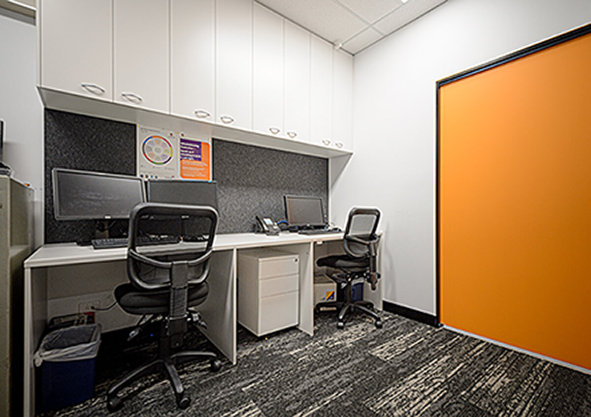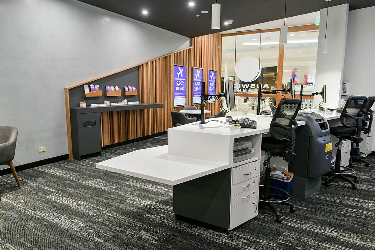 The large counter top made of white Corian provides a perfect backdrop for the purple and orange corporate logo. Multiple laminates were used for cabinetry in the Reception Counter, Kitchenette, Storage Cupboards, Internet Banking Kiosk, Customer Workbench, staff desks and LCD Display surrounds.