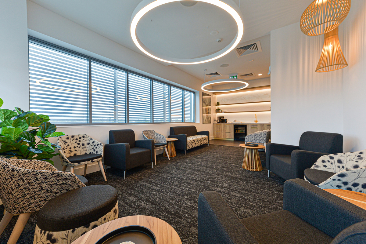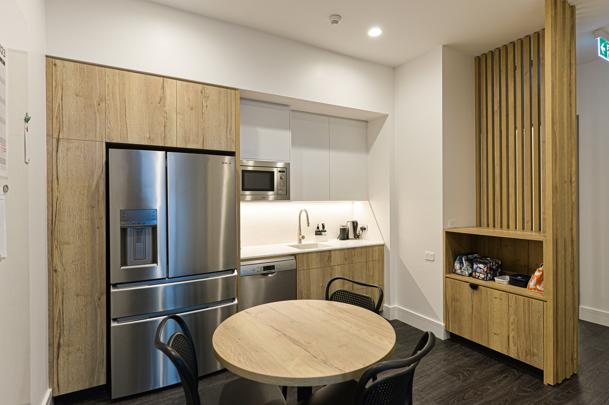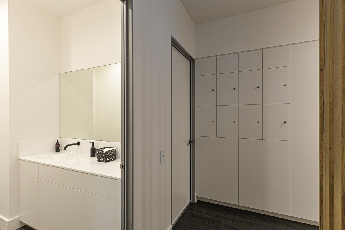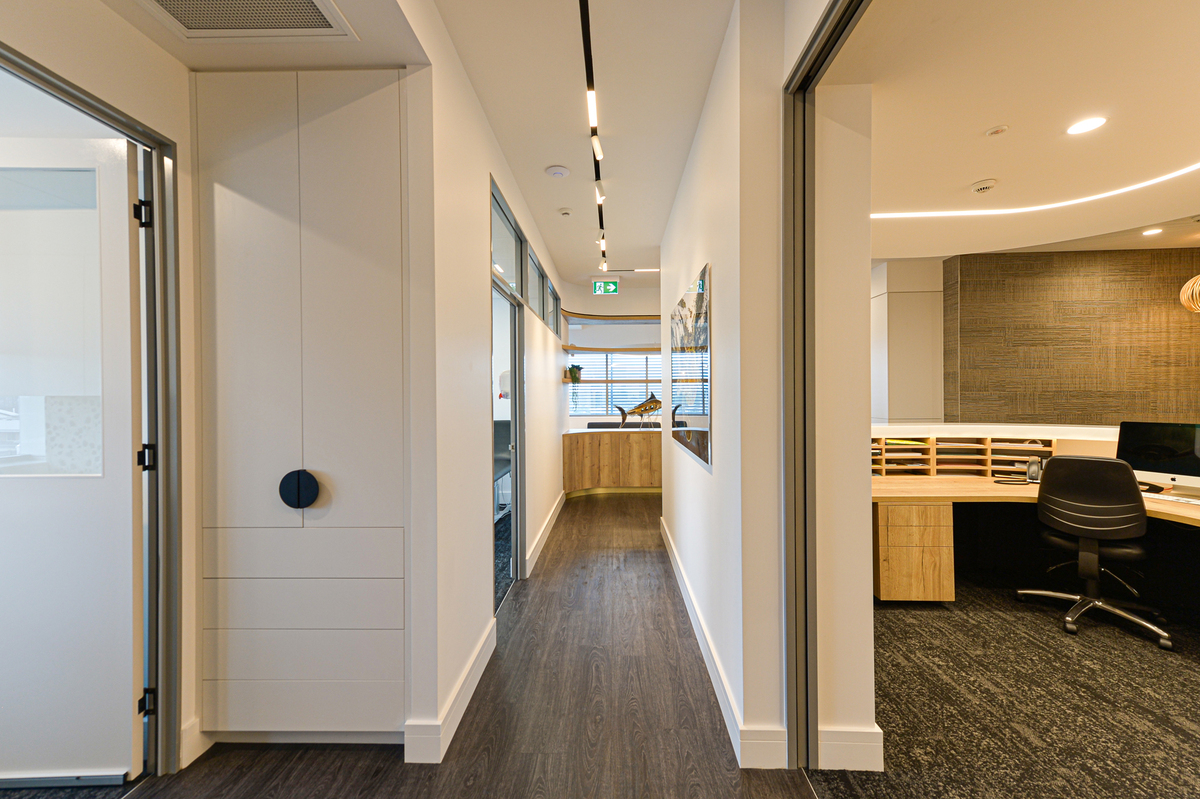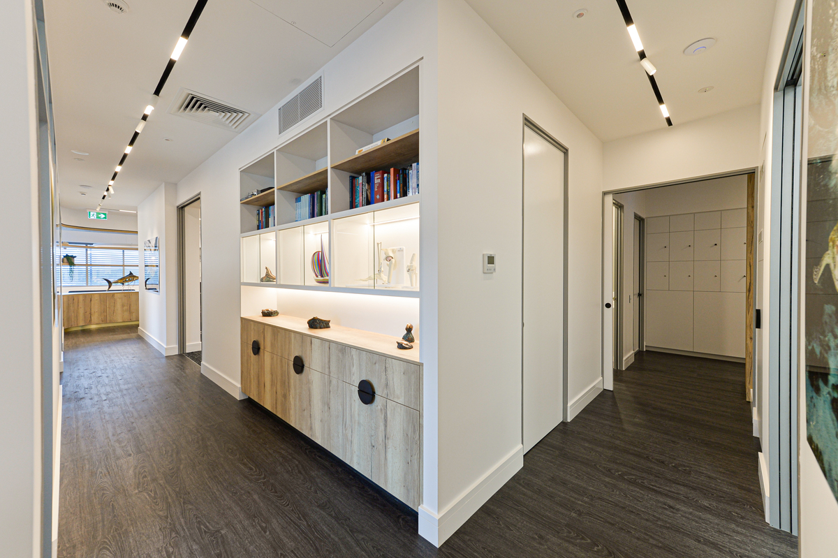 Treatment Rooms included Corian benchtops with moulded sinks providing a clean, joint-free surface. Electric-opening (servo-drive) overhead cupboards in the Treatment and Consulting Rooms conceal hand washing stations, while sensor taps and electric-opening (servo-drive) under-bench cupboards contain waste bins, for touch-free handwashing. Large Pocket Doors by Furnware cleverly conceal the cleaning sink in the utility area.