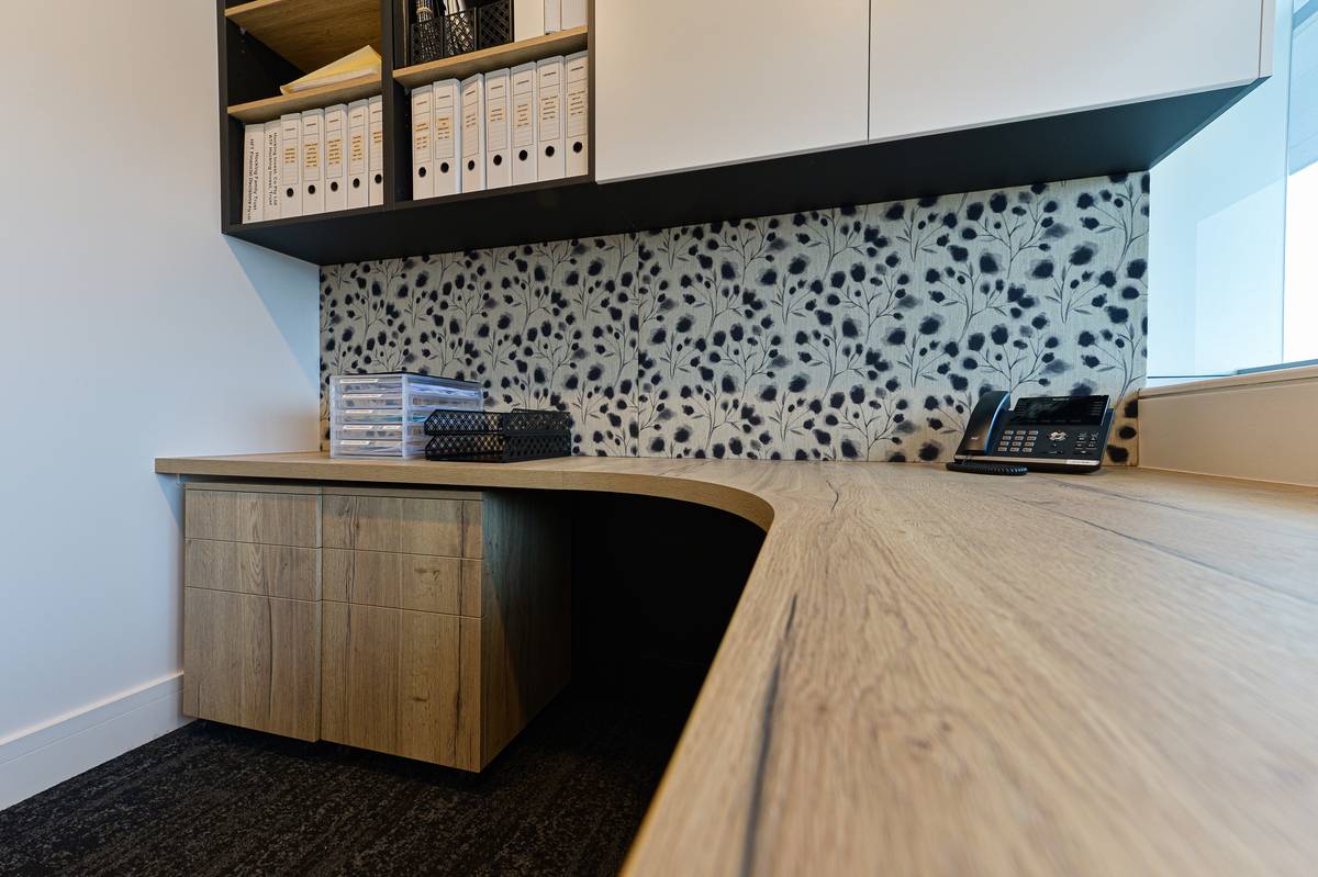Extensive use of Nikpol woodgrain benchtops, laminated door panels and timber battens compliment the stunning back-lit Corian reception counter, while pinboards covered in Warwick fabric complete the look. The patient waiting room boasts a Kitchenette with backlit Corian splashbacks complete with Zip Hydroboil Tap, drinks fridge, and drawer dishwasher. Formica laminate was used extensively throughout and Lo and Co Handles were selected to compliment the fitout.