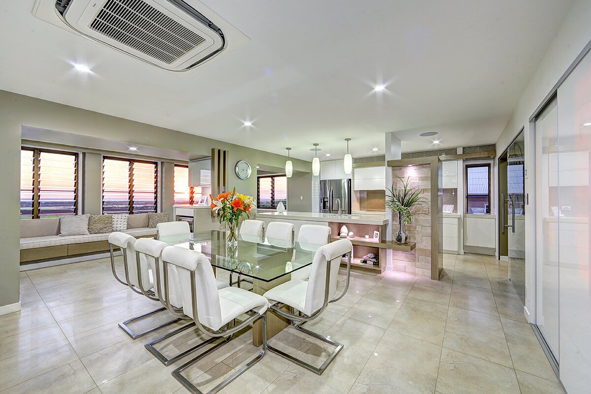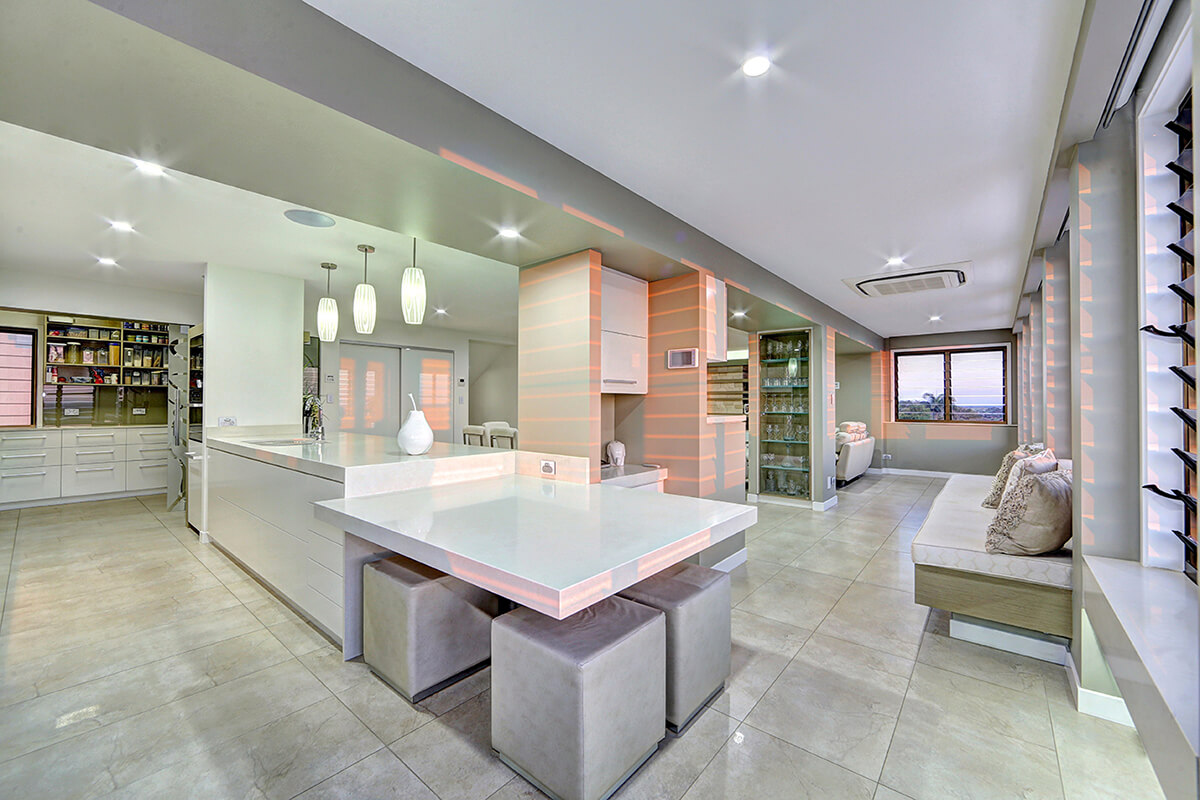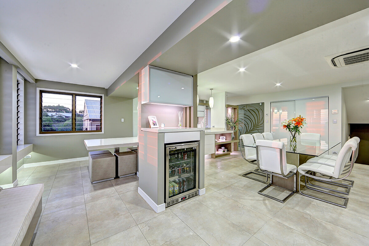 The kitchen layout includes a casual meals area incorporated into the island bench. Not only does this aspect add to the functionality of the kitchen, the lowered bench top integrates with the adjoining living area.