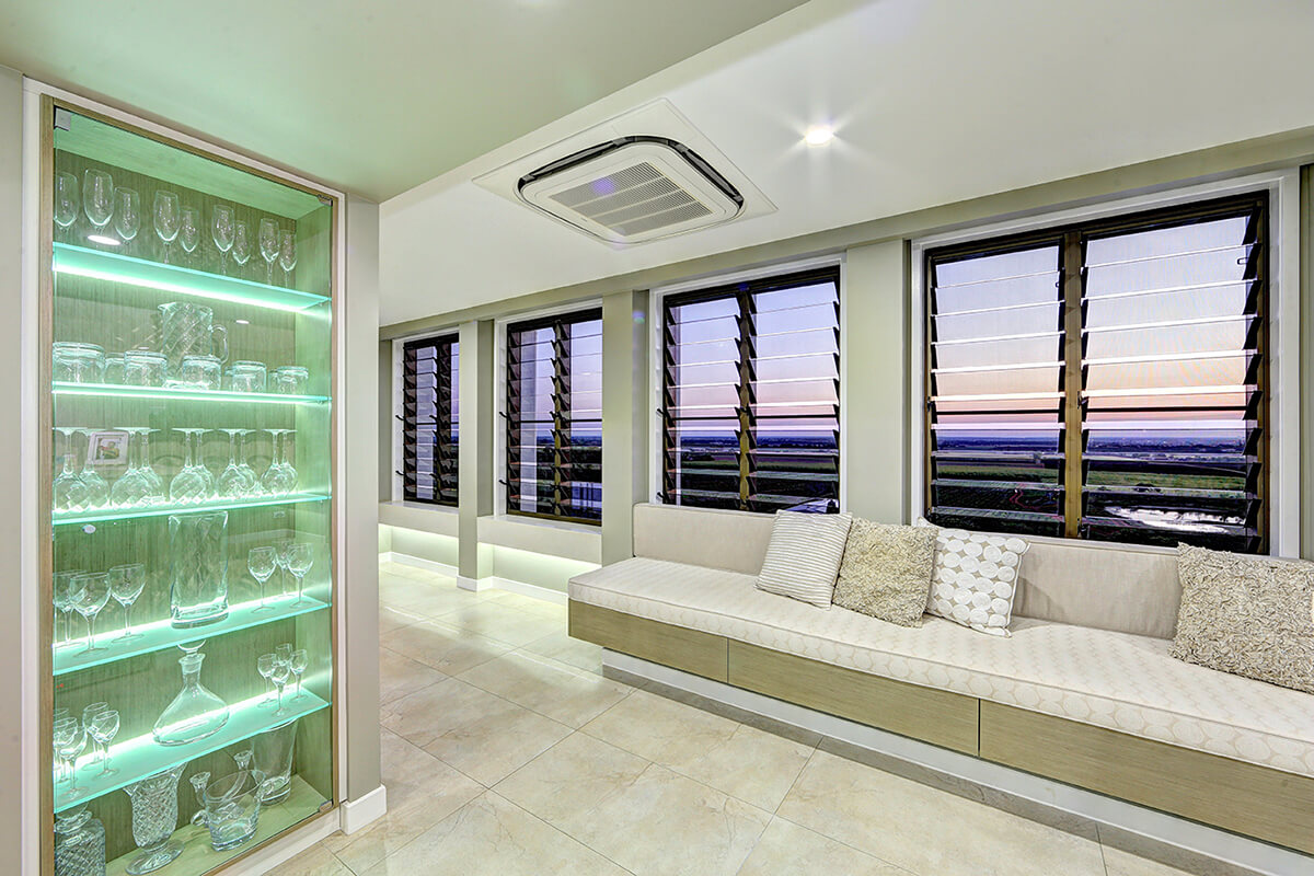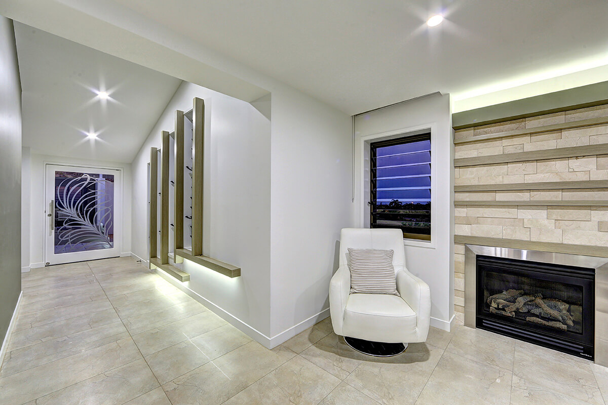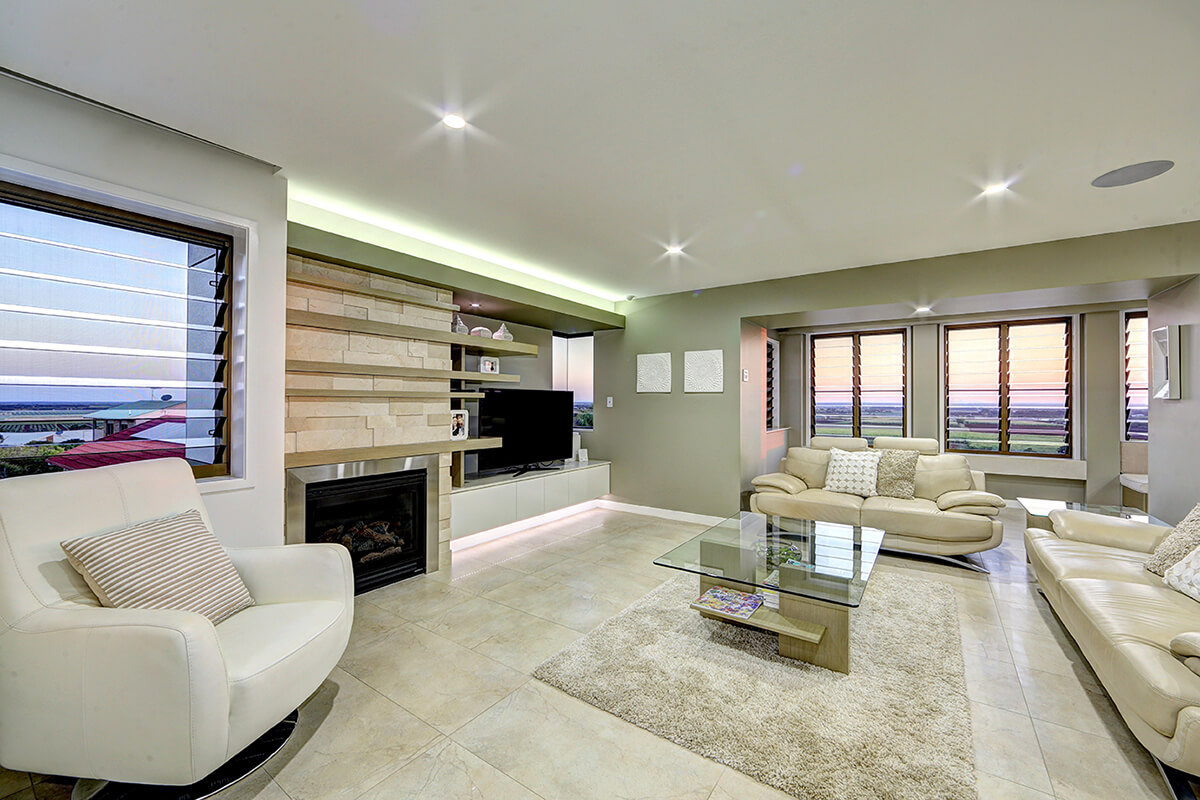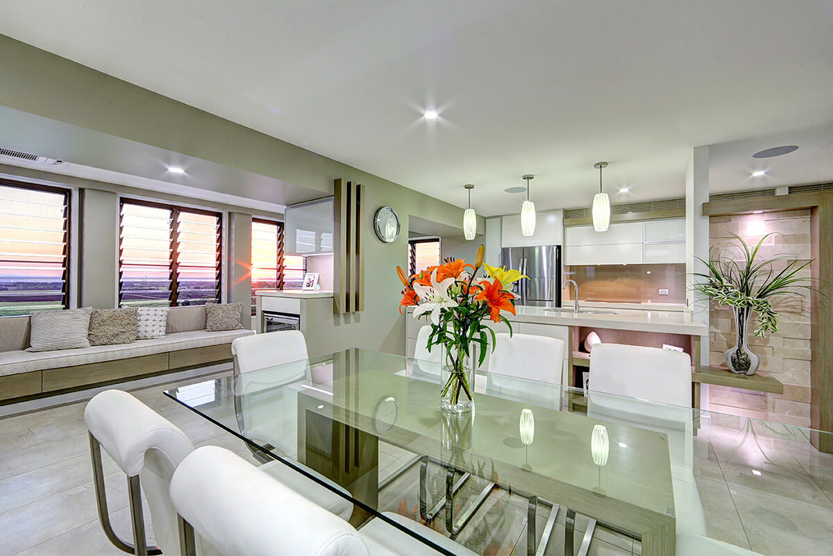 The kitchen layout includes a casual meals area incorporated into the island bench. Not only does this aspect add to the functionality of the kitchen, the lowered bench top integrates with the adjoining living area.