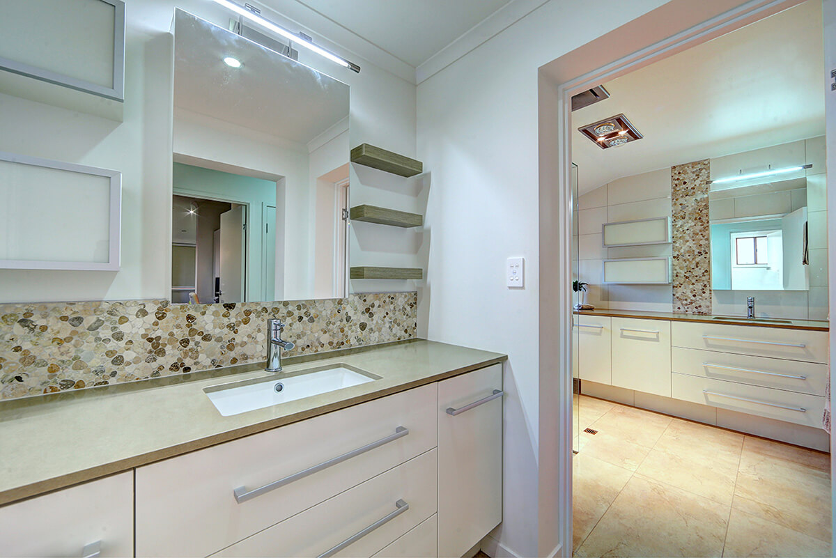 Gleaming stone bench tops and two pack cabinetry, balanced with timber bulkheads and open shelving, create a contemporary workspace. The clean lines of the kitchen are enhanced by glass splashbacks, painted to match the internal paint colour.