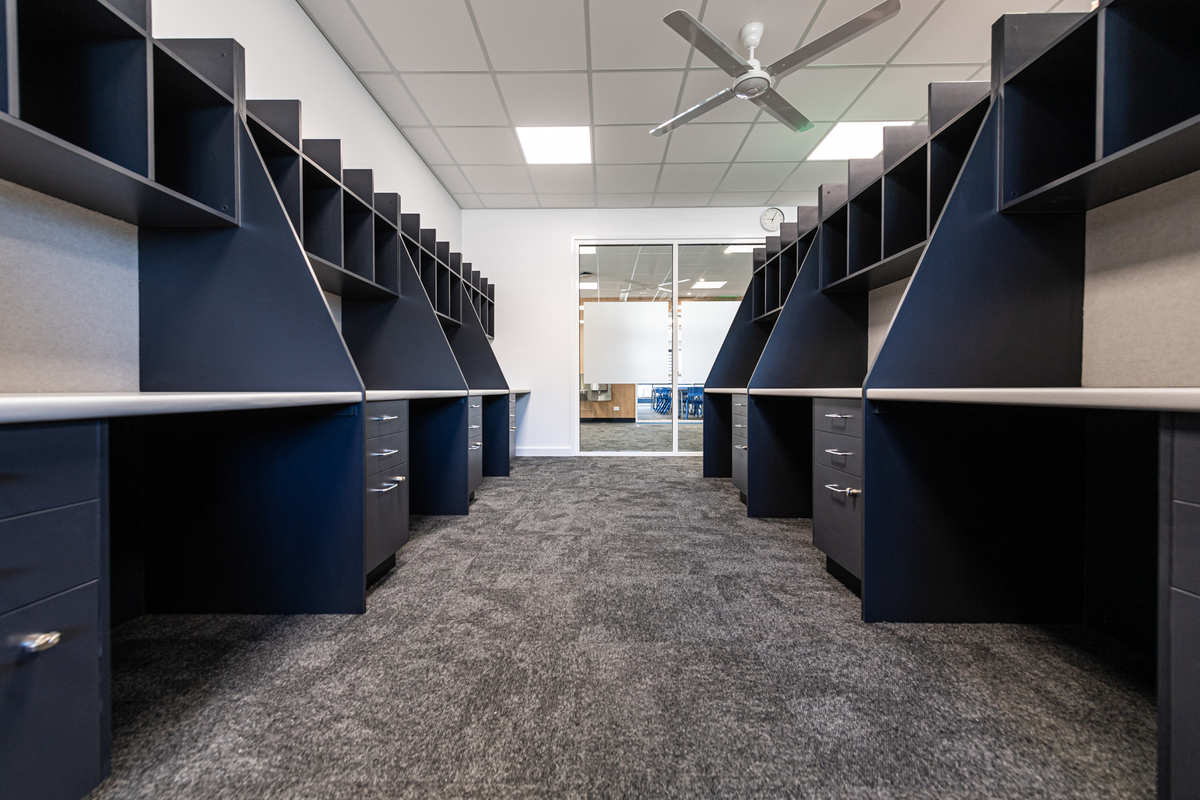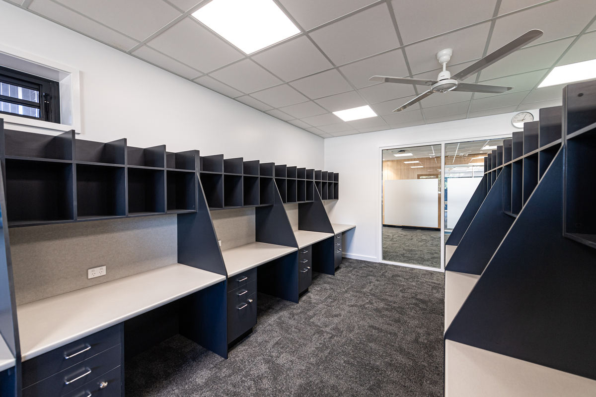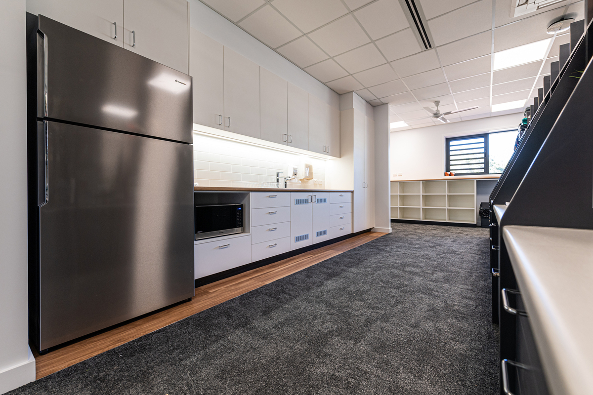 Within the staff quarters, Adina installed 16 workstations featuring laminated benchtops, open overhead shelving, and gables separating each workspace. A compact kitchenette was also fitted, complete with laminated tops and cabinetry, along with a full-length laminated bench along the southern wall providing additional open shelving beneath.