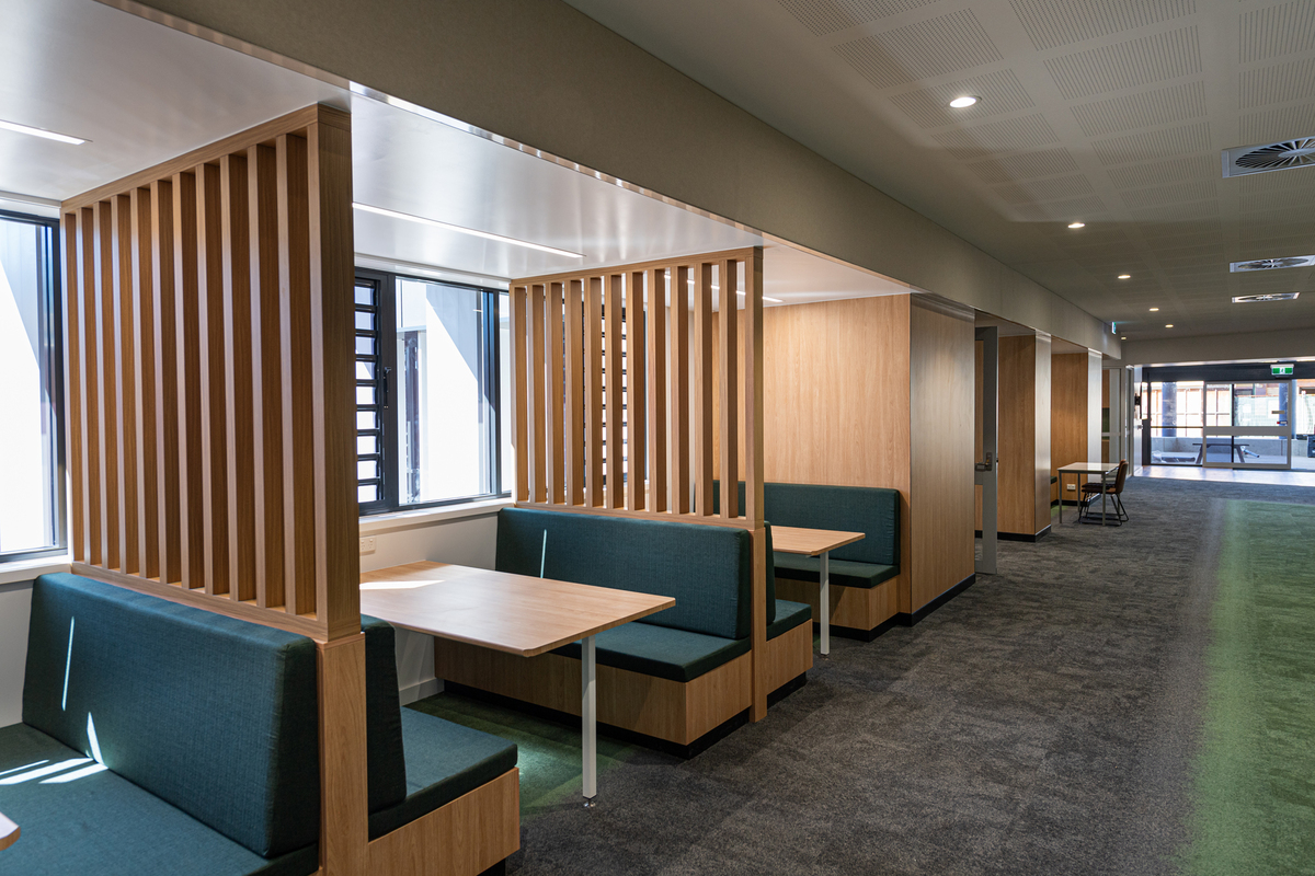 The project included the manufacture and installation of custom booth seating separated by Knotwood Sumblimated Timber Grain powdercoated aluminium battens, creating intimate enclaves for small group collaboration. Complementary long bench seating with Laminex - laminated bases, upholstered in Warwick fabrics carefully selected to match the school’s colour palette, adds both comfort and cohesion to the space. Matching timber-laminated cabinetry provides open shelving for resource materials, whil