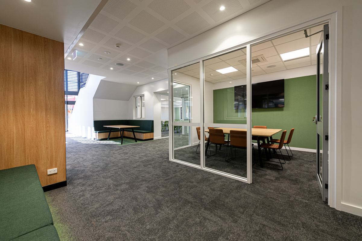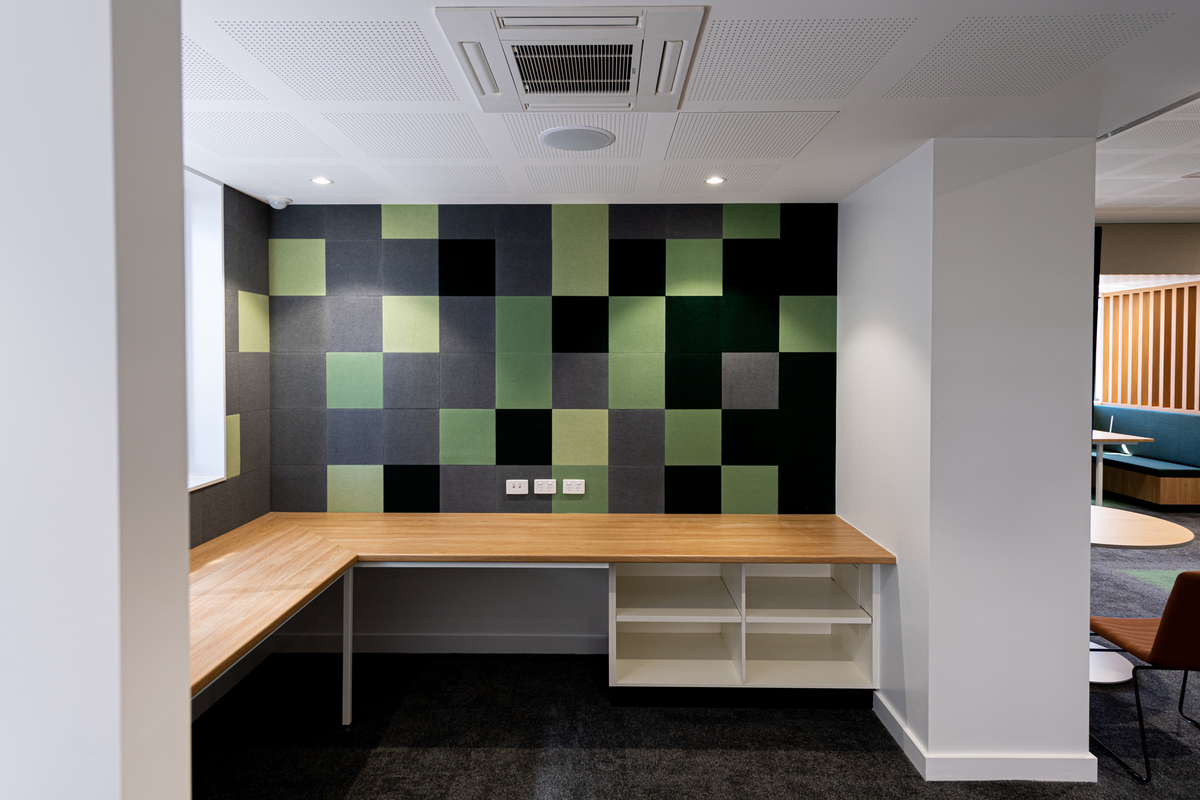 Individual offices were finished with high-quality laminated desks, drawer units, and overhead cupboards, ensuring both functionality and style across all areas of the building. Adina also supplied and installed a variety of Composition, Veriface, Cube and Peel n Stick acoustic Autex panels to the wall adjacent to the staircase and in selected office areas and classroom areas, enhancing both sound control and visual appeal within the learning and working environments.